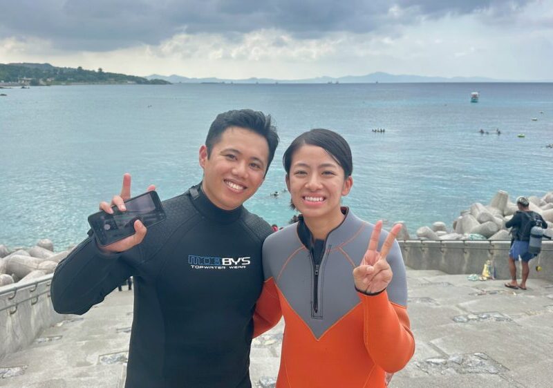 今日遊びにきてくれたTさん夫妻です。 北風でしたが、穏やかな海に変更して楽しみましょうね~ 落ち着いて呼吸もできて、クマノミの根まで移動してきました。 透明度が落ちていながらも頑張りましたね! お魚ともじっくり遊んで楽し