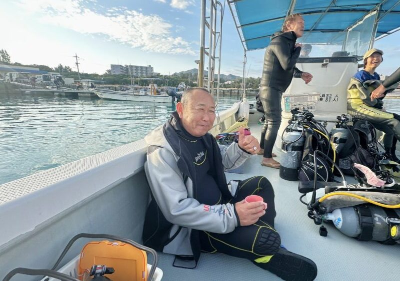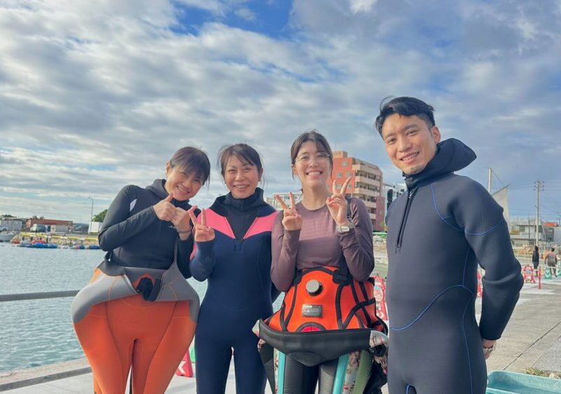 朝は曇っていましたが、青空の出るダイビング日和になってきましたね~ 今日は昨日からのMさんのライセンス講習と初来店のTさん、Tさん、Gさんの3名のファンダイビングです。 Tさん&Tさんは20年以上ぶりという強者、器材の使