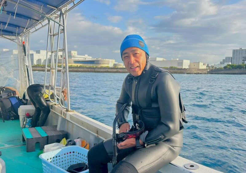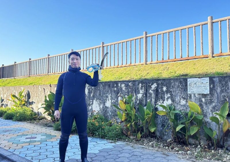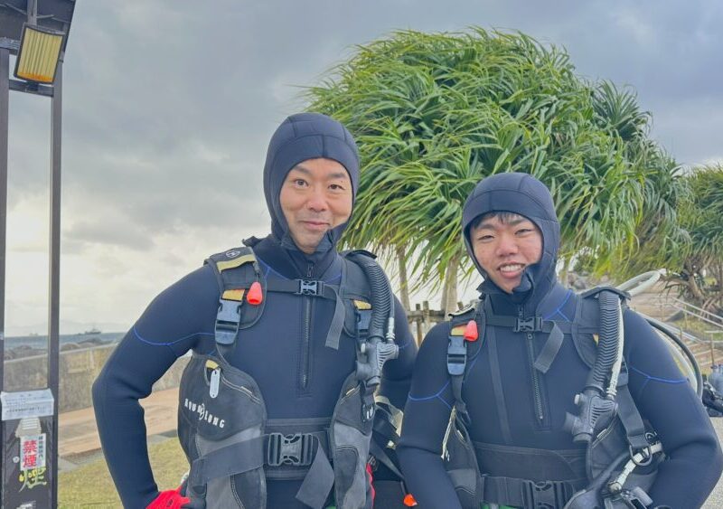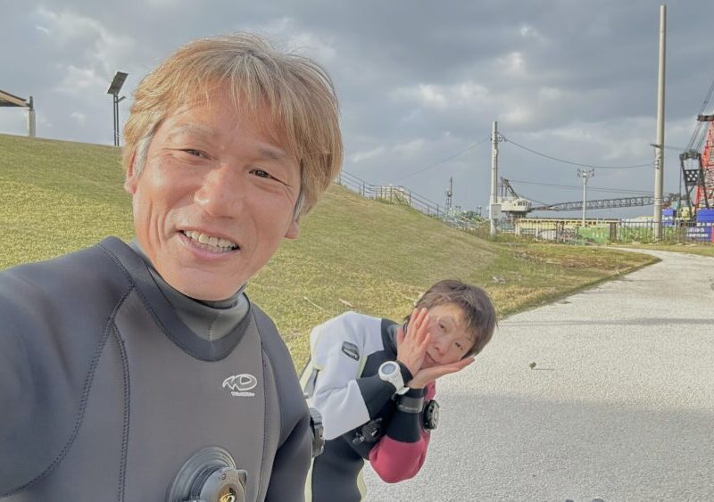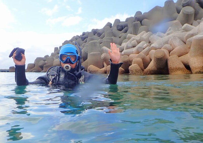 今日からライセンス講習のMさんです。 天気もすごくよくて、海も穏やかになりました!1月にしては珍しいですよ。 陽射しが入って、キラキラとした海ですね~、落ち着いて潜っていきましょう! 潜降の練習も最初はワタワタ、耳抜きも