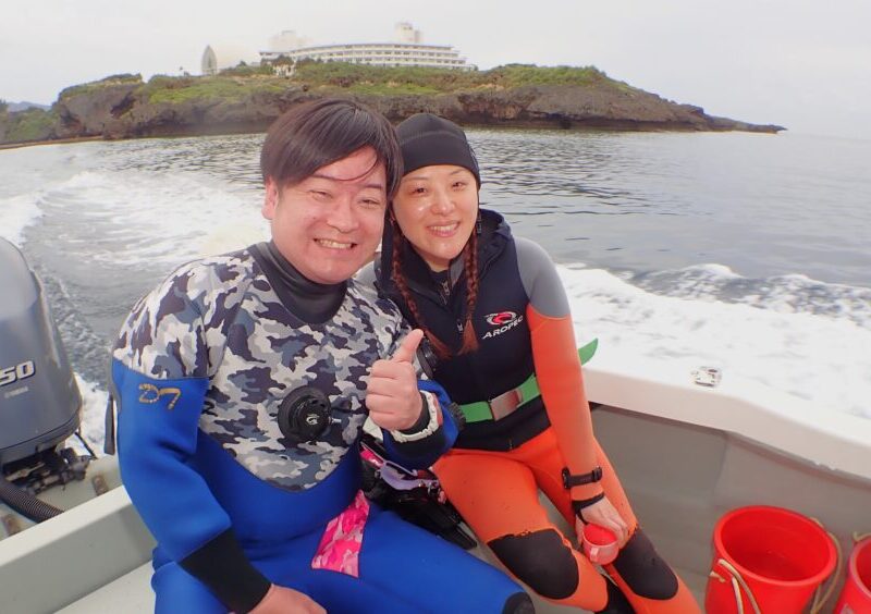 結構久しぶりに、Tちゃんが奥さんと遊びにきてくれました~ 初顔合わせですね! 奥さんは、まだダイビング初心者でドライスーツしか着たことがないので、ウエットスーツは初めて!水温22℃だけど頑張って潜ってもらいました~ 海に