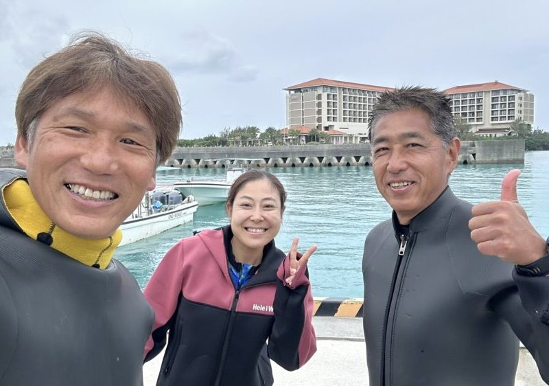 今日朝から来てくれたAさん、Mさん、Iさんの3名です。毎年ちょっと寒い時期にAさんは来てくれます。今年は体験ダイビングの2人と一緒に潜りましょうね! 体験ダイビングでもボートからバックロールで入って、ロープを持ちながら耳