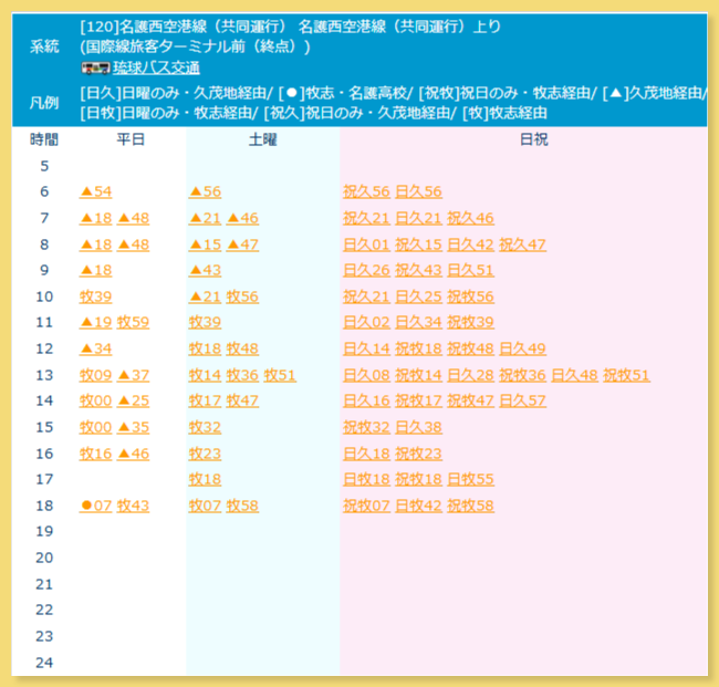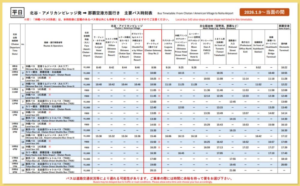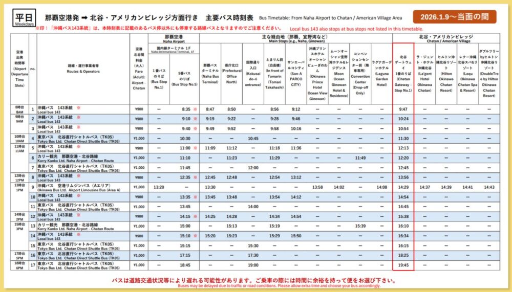 空港発は朝8:35~18:45まで、北谷直行バスが9本、143番の路線バスが8本もあり、平日、土曜、日祝にも分けられています。