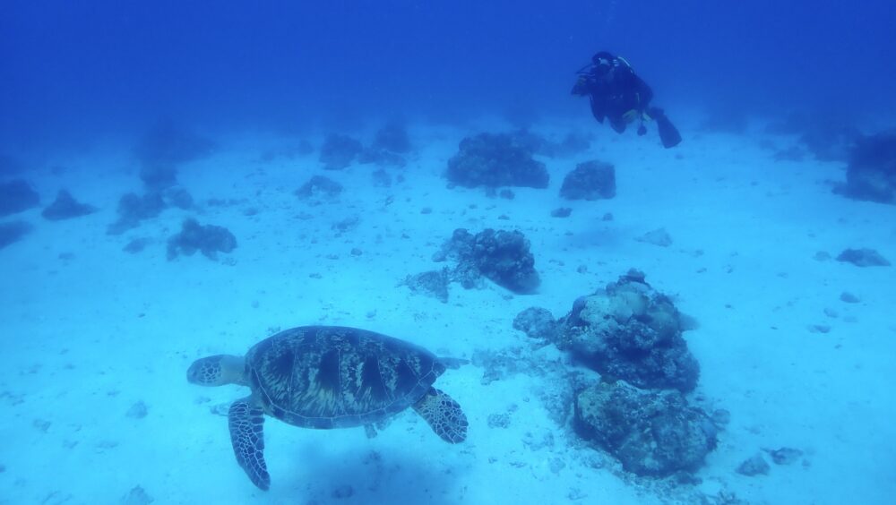2本目の砂地は少し流れがありながらも、ウミガメが泳いでいると追い駆けてしまいましたね!
