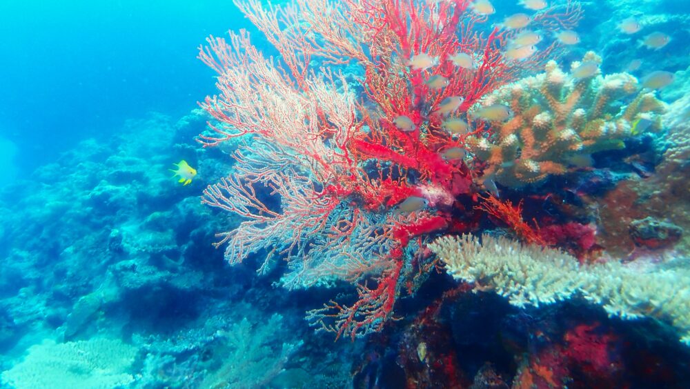 イソバナに泳いでいるたのはヤマブキスズメダイの幼魚、かわいいですね~