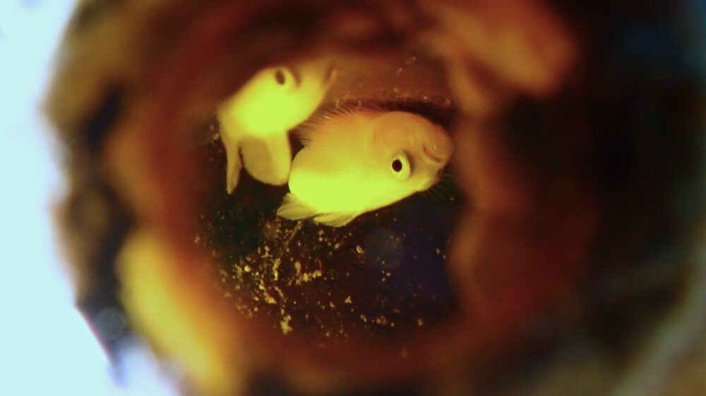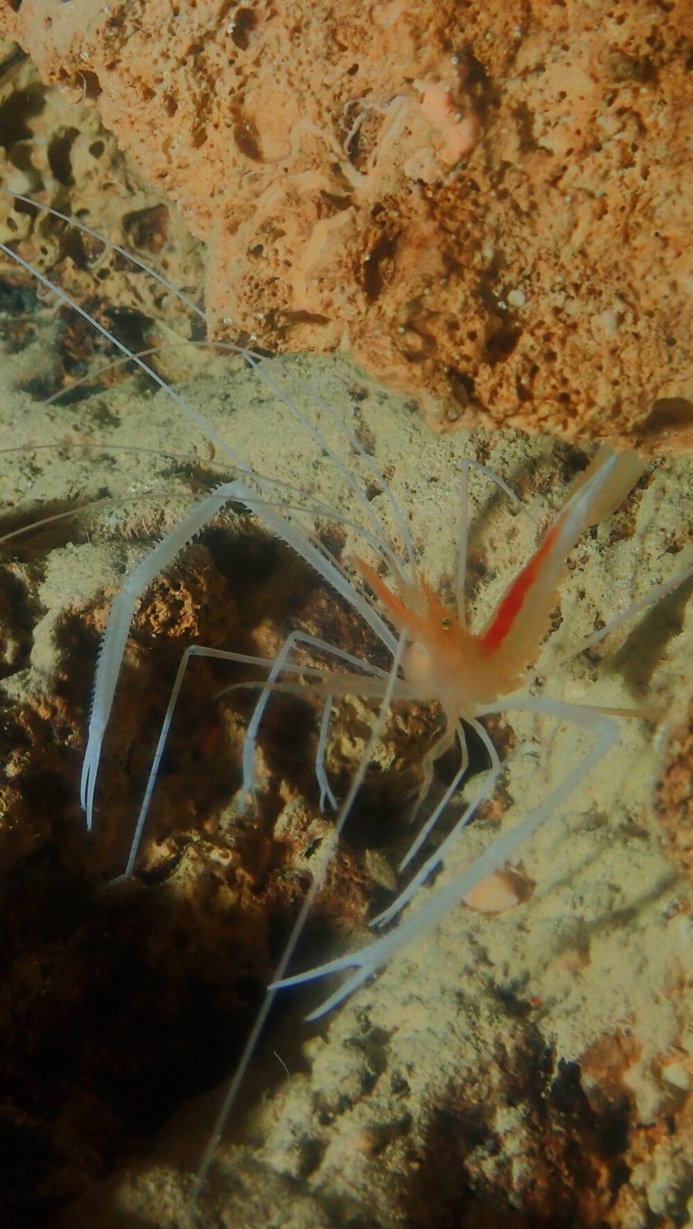 掘り込みの穴に隠れていたのはクメジマオトヒメエビ、鮮やかな白がいいですね~
