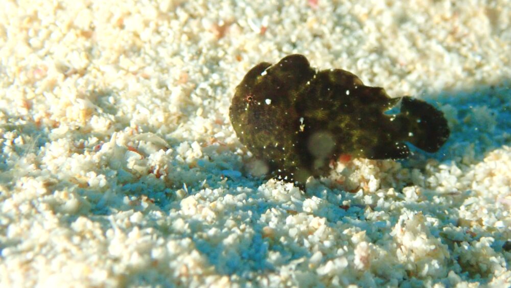 近くのサンゴの欠片には、カエルアンコウが隠れています。