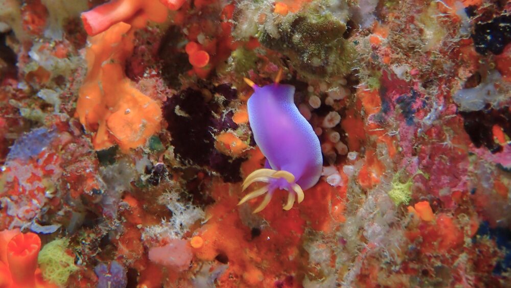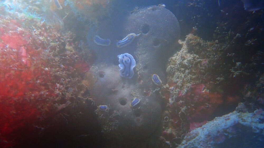 カイメンをもぐもぐ食べているミゾレとコールマンウミウシがいっぱいですね!