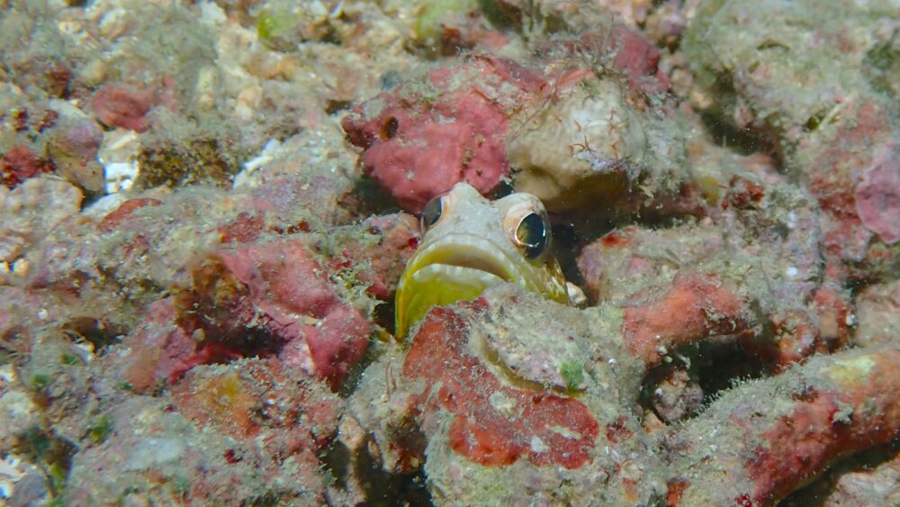 ガレ場の穴から顔を出しているアゴアマダイ、ジョーフィッシュのカエルアマダイとはちょっと違うけど、近くまで寄れてかわいいですね!