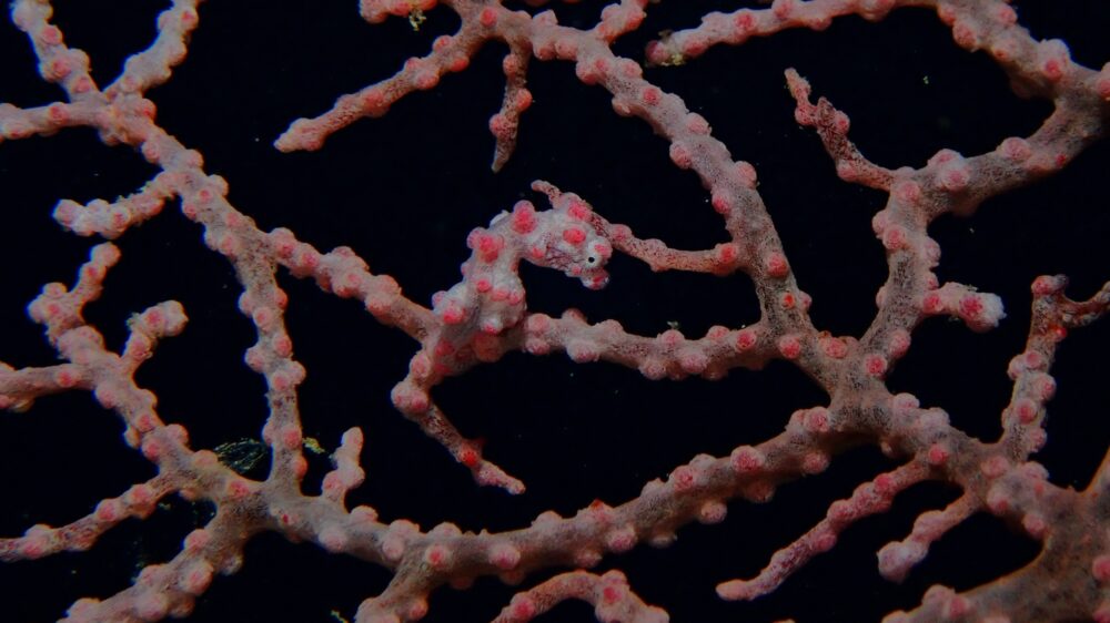ナマコの裏に隠れていたウミウシカクレエビ、カラフルでなんか、ウルトラマンの怪獣のバルタン星人みたいに見えるんだよね。