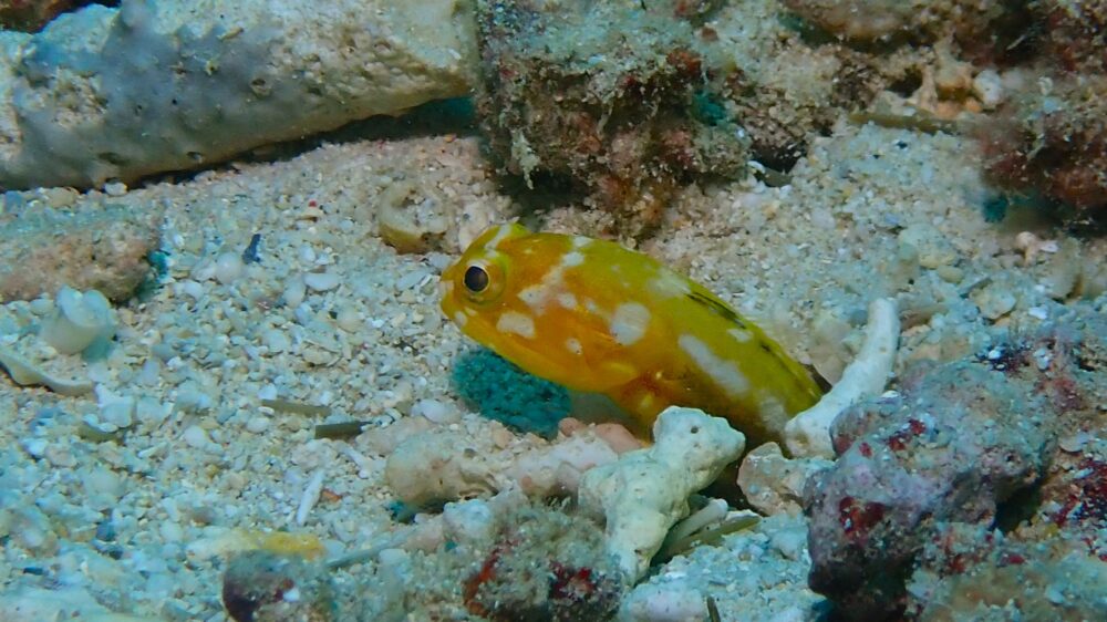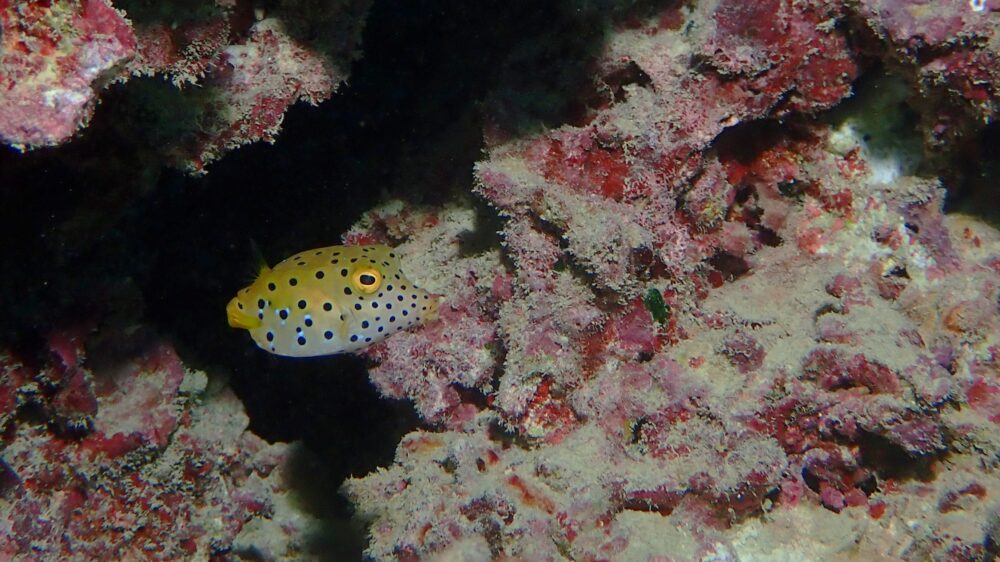 まだ小さいけど、ちょっと黄色が薄くなってきたミナミハコフグです。