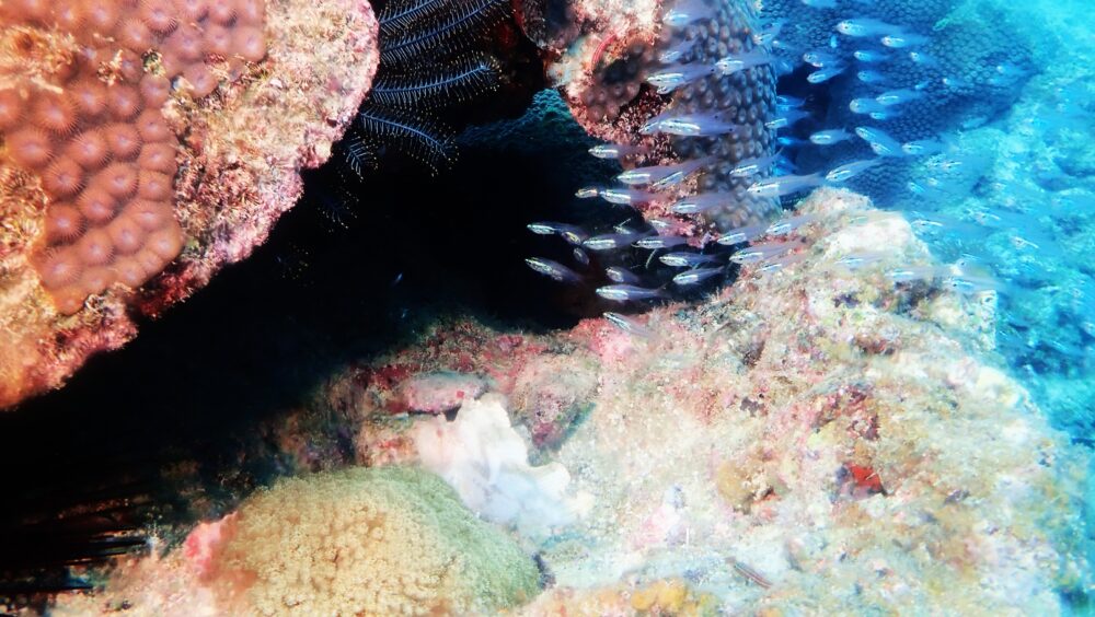 ソフトクリームのような根にスカシテンジクダイと、それを狙っているハダカハオコゼがいたよ~