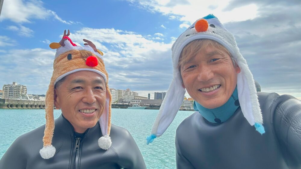 12月に入って気が早いサンタの帽子被ったおじさん二人です。