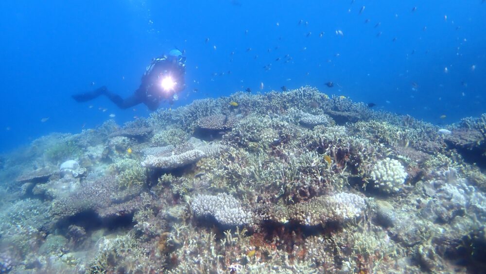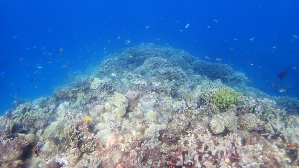 クロスラインの棚上、今日は透明度も良くて写真を撮りたくなりました。サンゴと小さな魚たちがとってもきれいで癒やされるシーンですね~