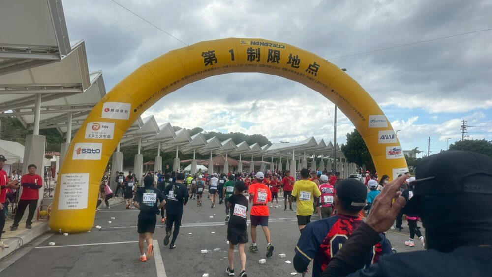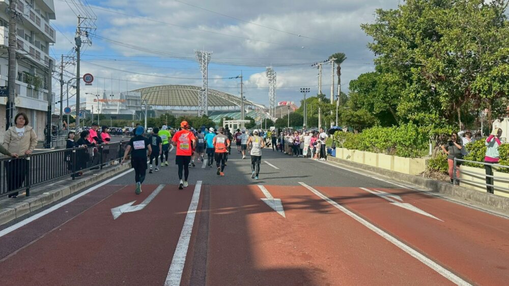 30kmからは8~9分/kmのスピードになり、走っては歩き、応援の方にエアーサロンパスをスプレーしてもらってまた走り出す、の繰り返しでした。