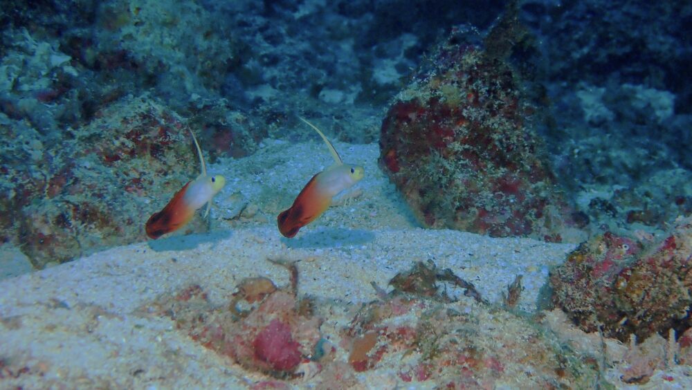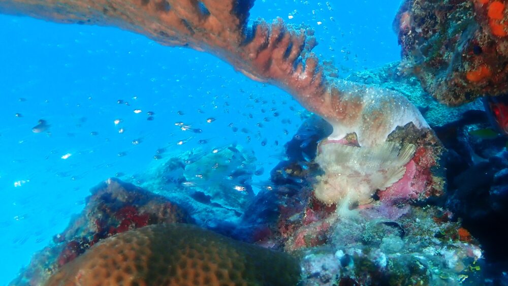 ここにも隠れてスカシテンジクダイを狙うハダカハオコゼ、捕食シーンはまだ見たことがないんですけどね・・・