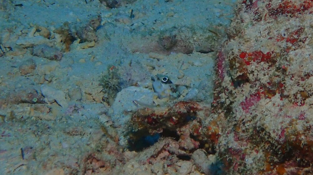 ガレ場近くに顔を出していたリングアイジョーフィッシュ、シャイでこれ以上は近づけない