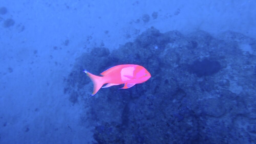 ドリームホールのドロップオフにいるスミレナガハナダイ、深くいるので派手さがわかりにくいんですよね~