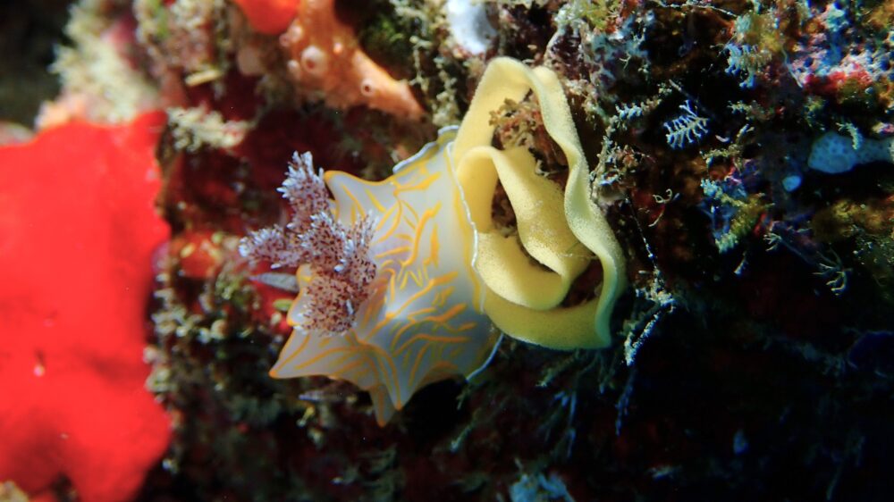 産卵中のキスジカンテンウミウシがいました。寒さに負けずがんばってますね~