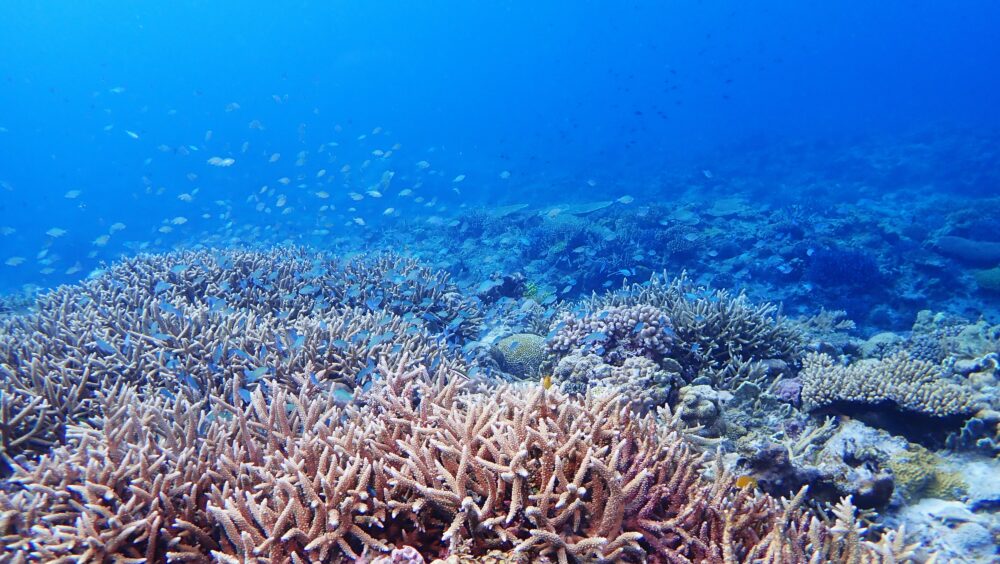 サンゴに群がるデバスズメダイの群れが冬の海を忘れさせてくれますね~