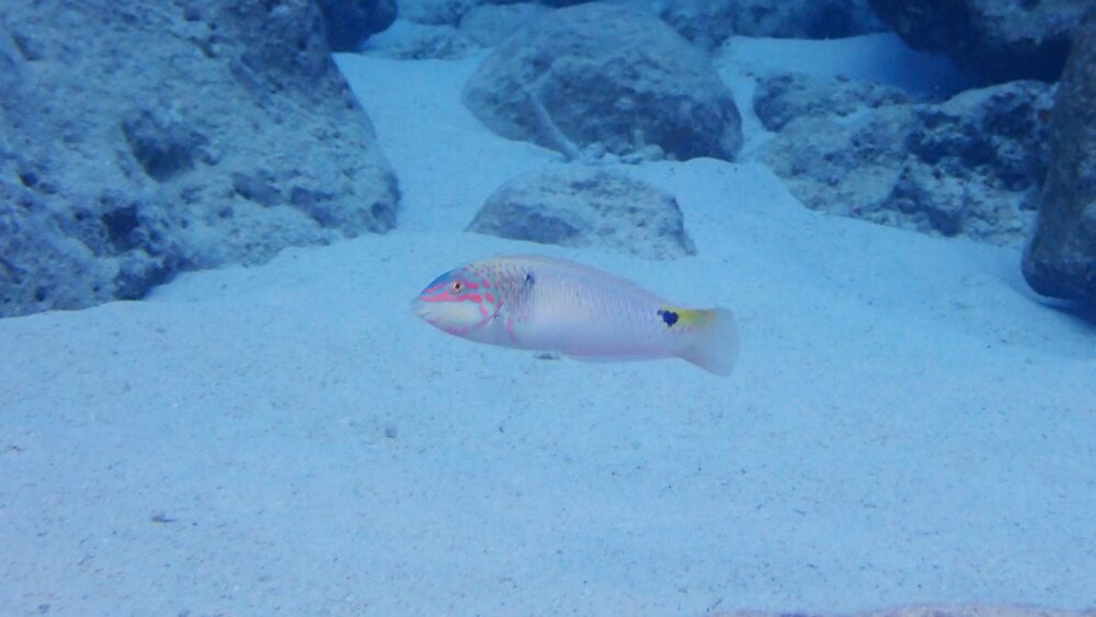 上品なベラ、白とピンク色を持つミツボシキュウセンです。