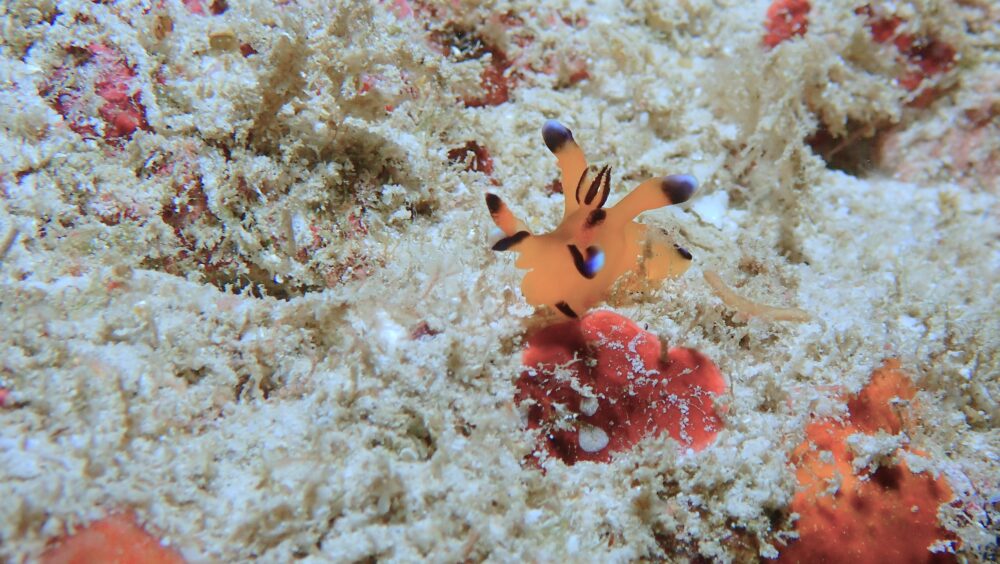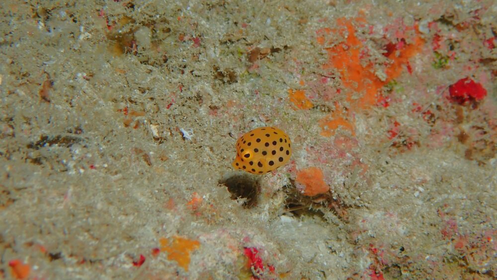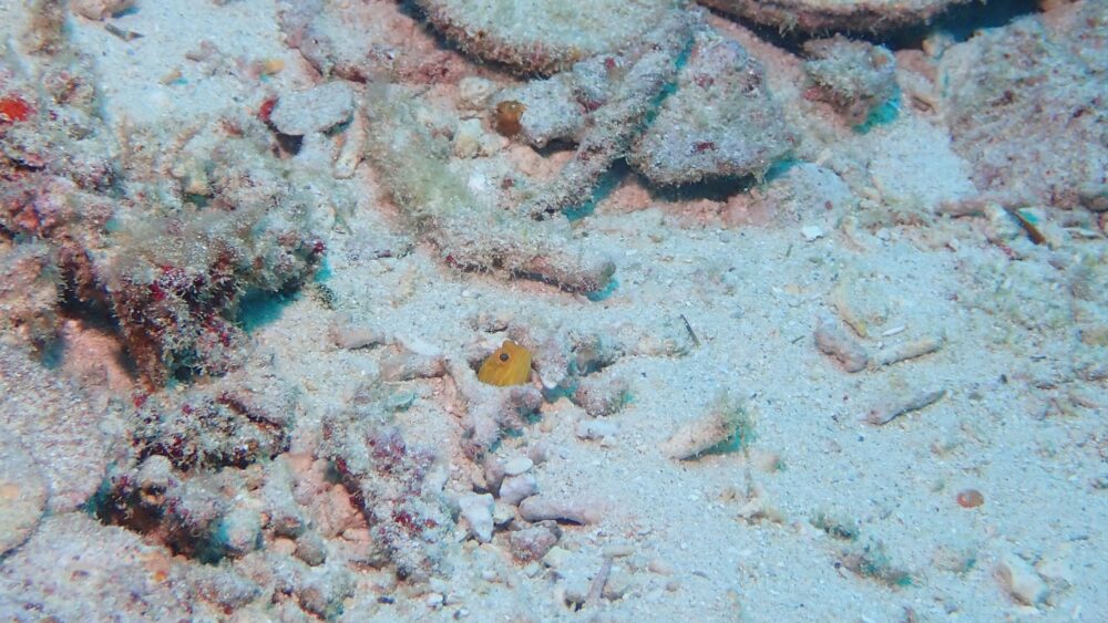 黄色の生き物3連発で、まんまるミナミハコフグです。体長1cmほどのかわいい子でした。
