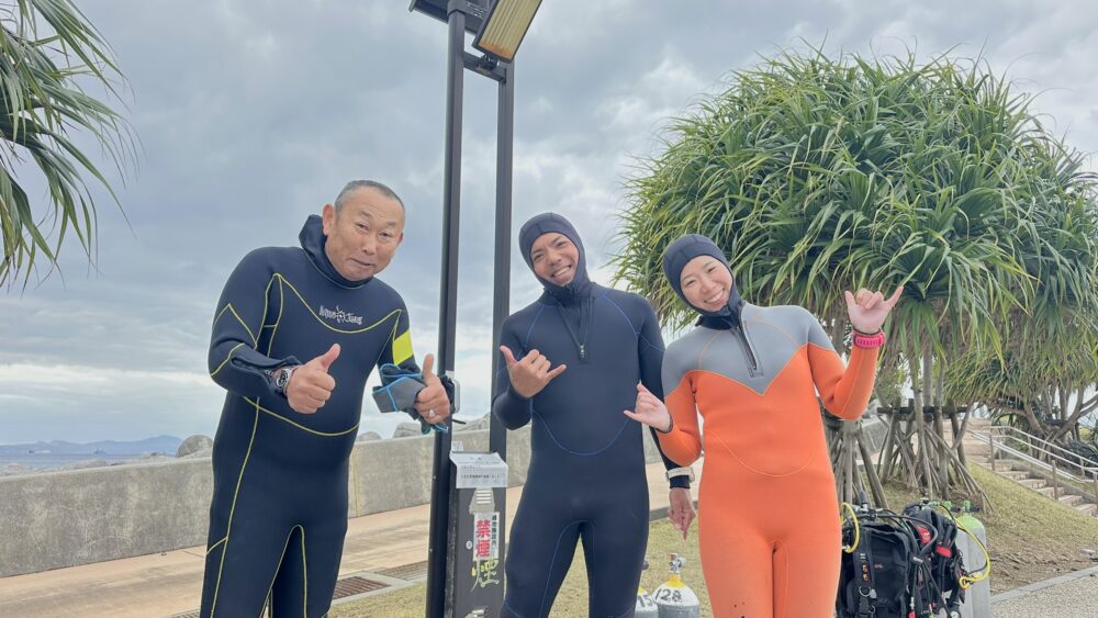 2ダイブ目も寒かったけど、潜ってきたよ!寒さを感じないポーズを取ってくれました!