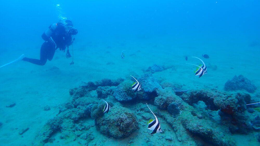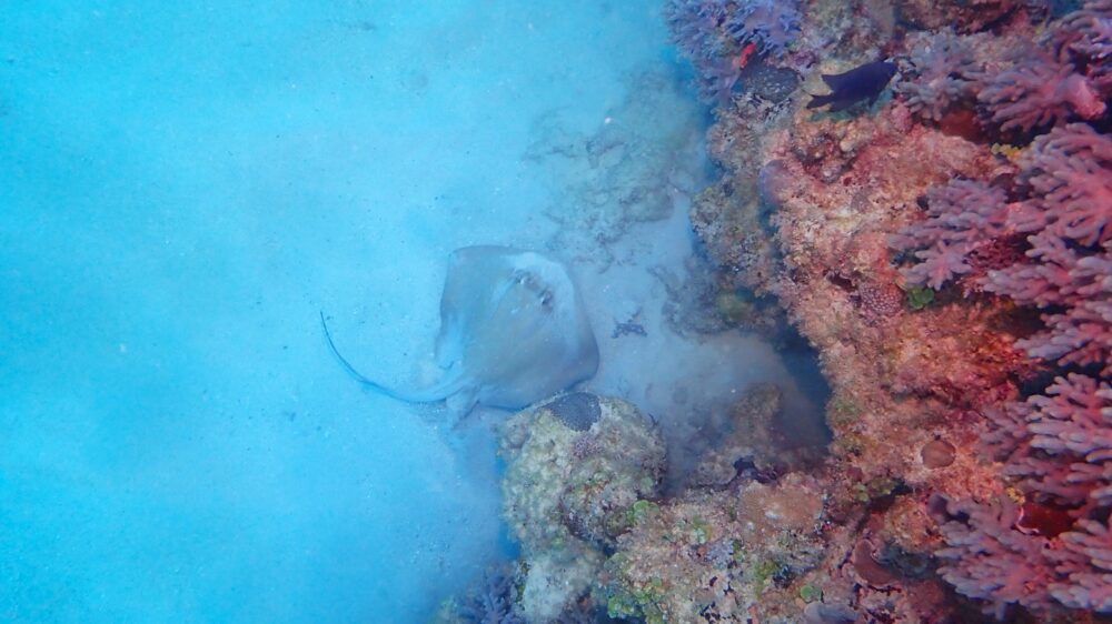 砂地と大きな根が点在するエリアを水中探索していると、砂に潜っていたヤッコエイがモゾモゾした後、ビューっとあっという間に泳いでいきました~