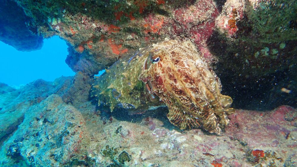 1本目の帰りに見つけたのが大きな大きなコブシメが3個体、2本目も同じポイントだったので探してみたら、1匹岩陰に隠れていましたよ。ホントに大きくて体長80cmほどありました。