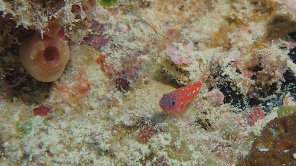 小さなベニハゼも色がキレイで撮りました。この子はカメラを近づけるとすぐに隠れるので、この大きさくらいまでしか寄れないんですよ~