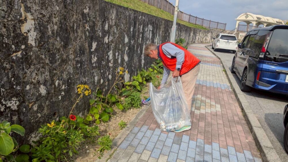 遊歩道の下の道路を担当してのゴミ拾いですが、ここでは吸い殻のポイ捨て、ペットボトルなどがよく落ちています。