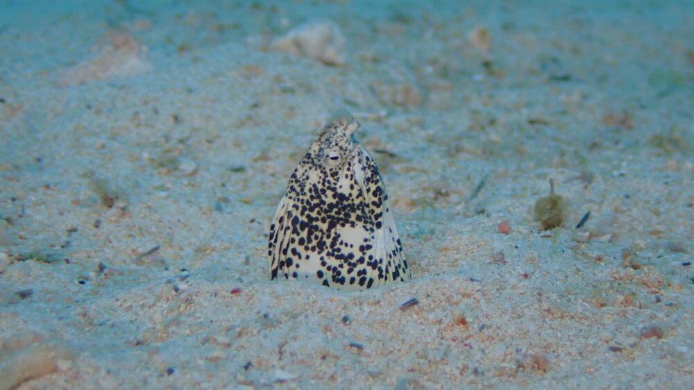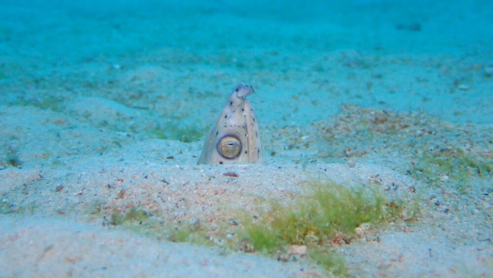 砂地から頭だけ出しているミナミホタテウミヘビ!近づいても引っ込まないくらいダイバー慣れしていますね!