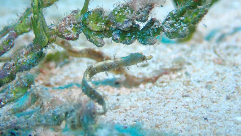 海藻の中にひっそりと隠れているのは小さなタツノハトコ!細くてスリムな体ですがタツノオトシゴの仲間ですよ♪