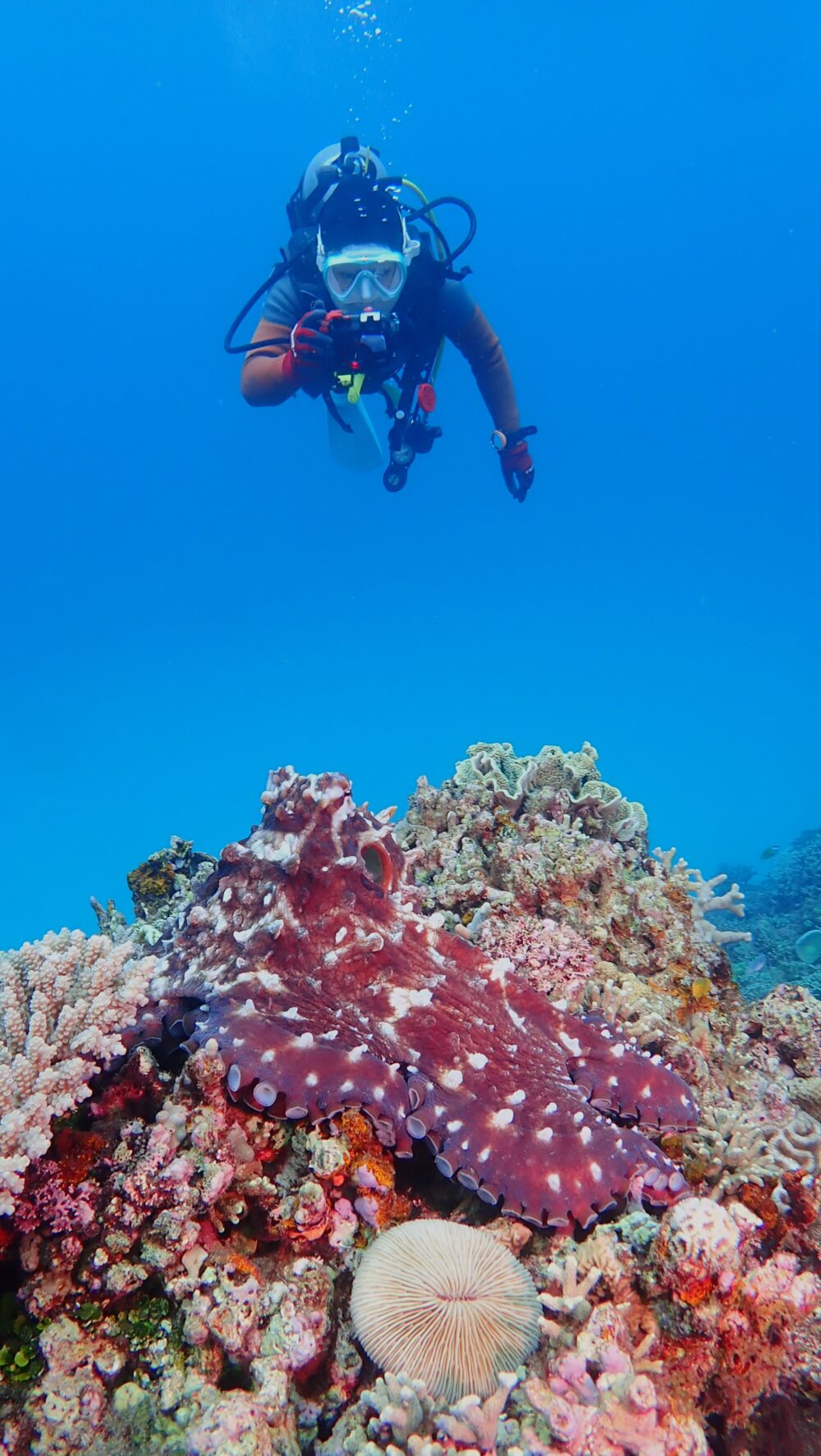 岩の上にどーんと居座っていた大きなワモンダコ!赤褐色の体で見応えたっぷりでした!