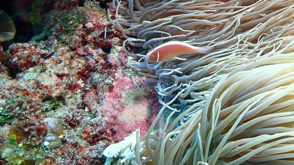 Kさんはイソギンチャクに隠れているトウアカクマノミを喜んで激写していました~!