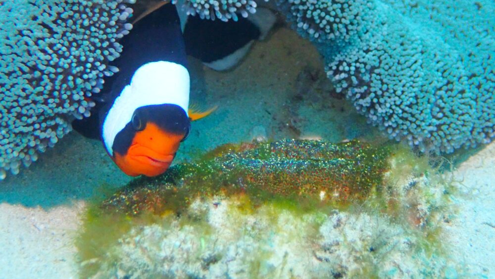 長い触手のイソギンチャクにいるハナビラクマノミ。産卵しているシーンは珍しく、卵は白っぽい色なんですね・・・